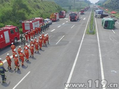 為切實推動“迎接十九大奮戰(zhàn)一百天忠誠保平安”消防專項行動縱深開展,做好各類災(zāi)害事故滅火救援準備工作,進一步提升戰(zhàn)區(qū)部隊聯(lián)合協(xié)同作戰(zhàn)能力,以優(yōu)異成績迎接黨的十九大勝利召開,9月21日,廣西消防總隊在包茂高速梧州支線開展全區(qū)高速公路交通事故救援跨區(qū)域綜合演練。共調(diào)集梧州、玉林、貴港3個消防支隊共18輛消防車108名官兵,梧州市應(yīng)急辦、交警、醫(yī)療、通信、路政等應(yīng)急聯(lián)動部門7車45人參加此次演練。