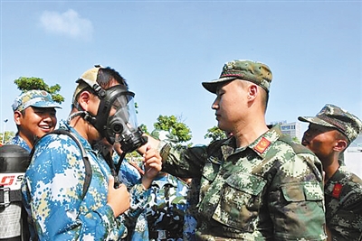 海南大學學生軍訓現場,海口消防支隊消防官兵向學生教授消防器材的使用方法。海口市公安消防支隊供圖