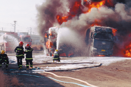 11月16日,鞍山海城東四鎮一大型物流公司停車場,兩輛大貨車與一輛油罐車相撞,導致30噸油罐車裝載的汽油泄漏起火。海城消防調集人員火速前往撲救處置,經一小時工作,大火被撲滅,現場無人員傷亡。